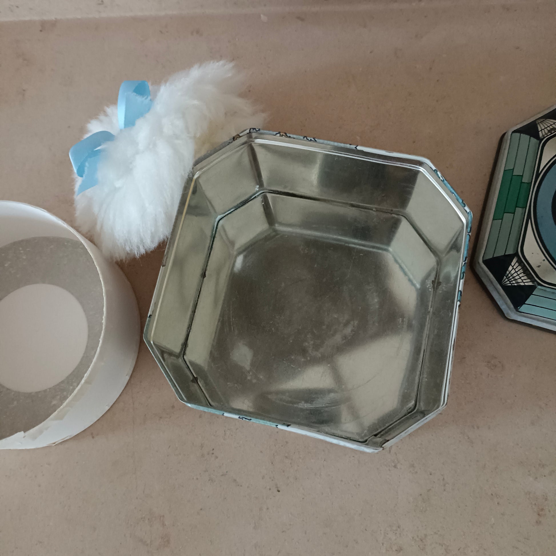 Boîte en métal octogonale, ancien poudrier Avon (poudre parfumée pour le corps / body talc) , il y a encore la houpette.
