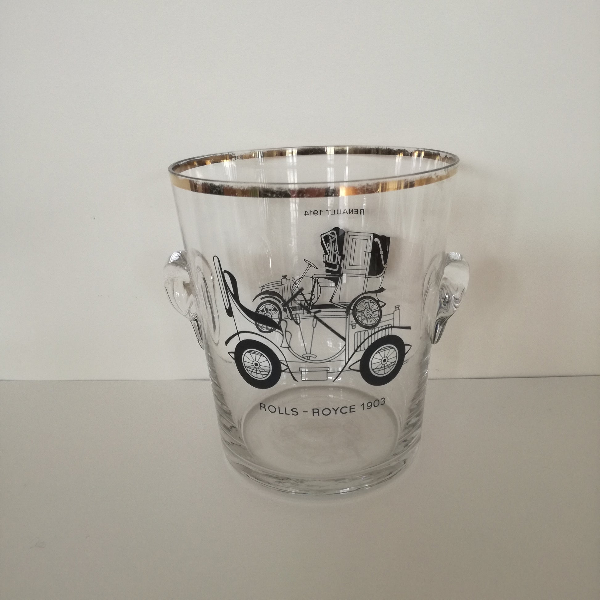 Seau à glaçons en verre à décor de voitures Rolls Royce 1903 et Renault 1914