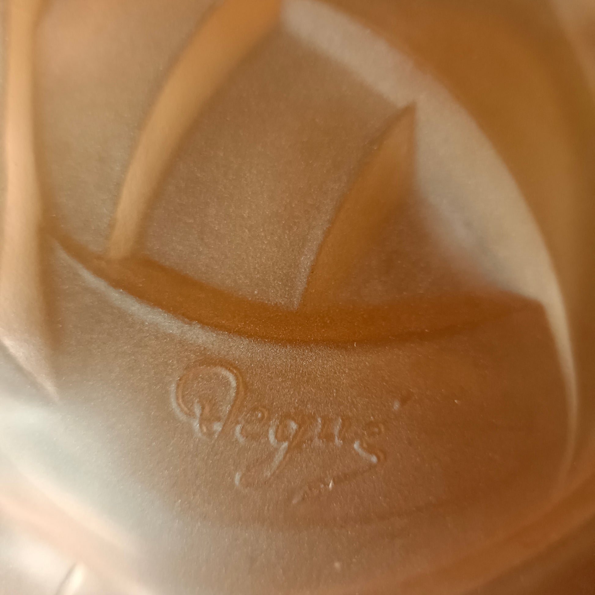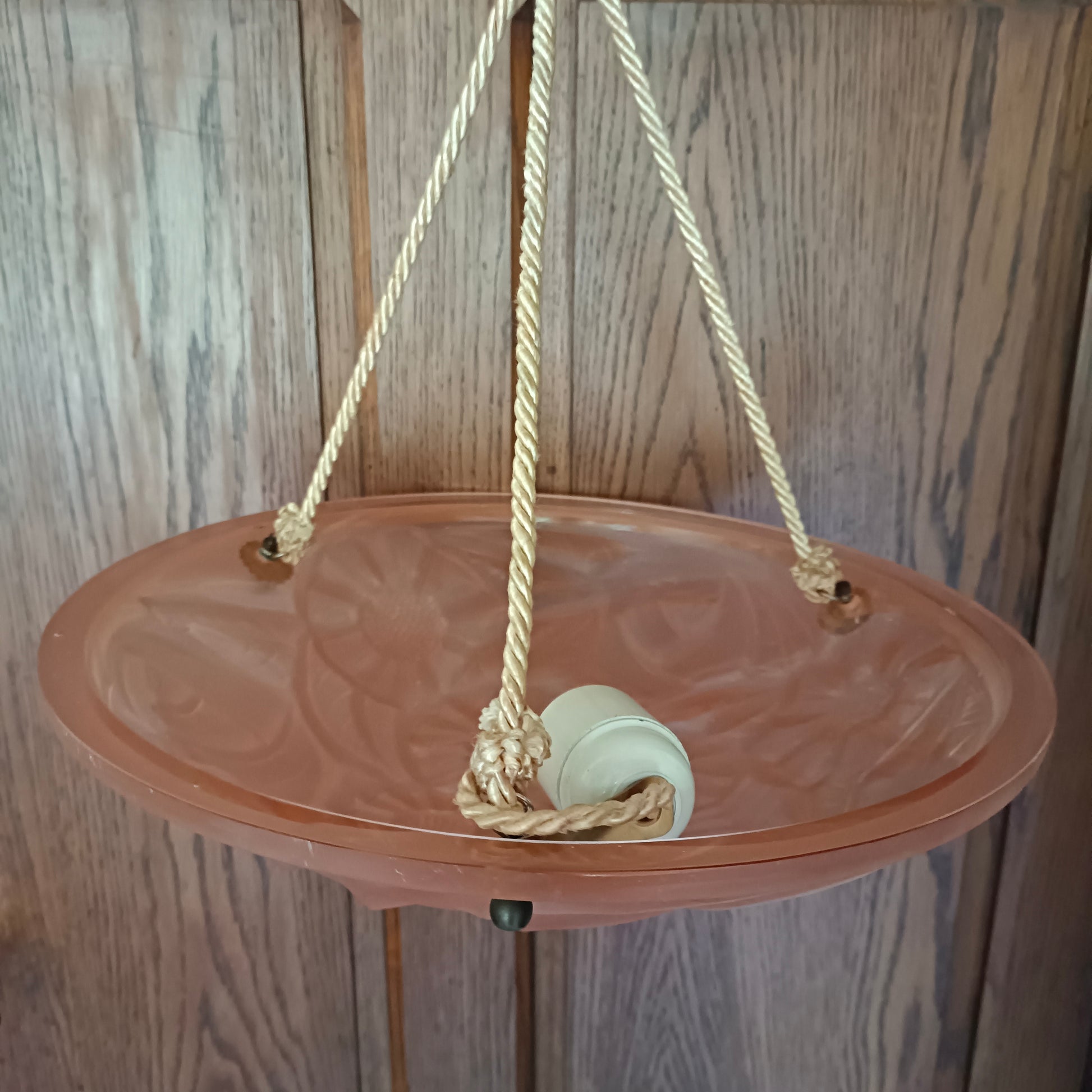 Suspension plafonnier Art Deco en verre pressé moulé rose signé Degué