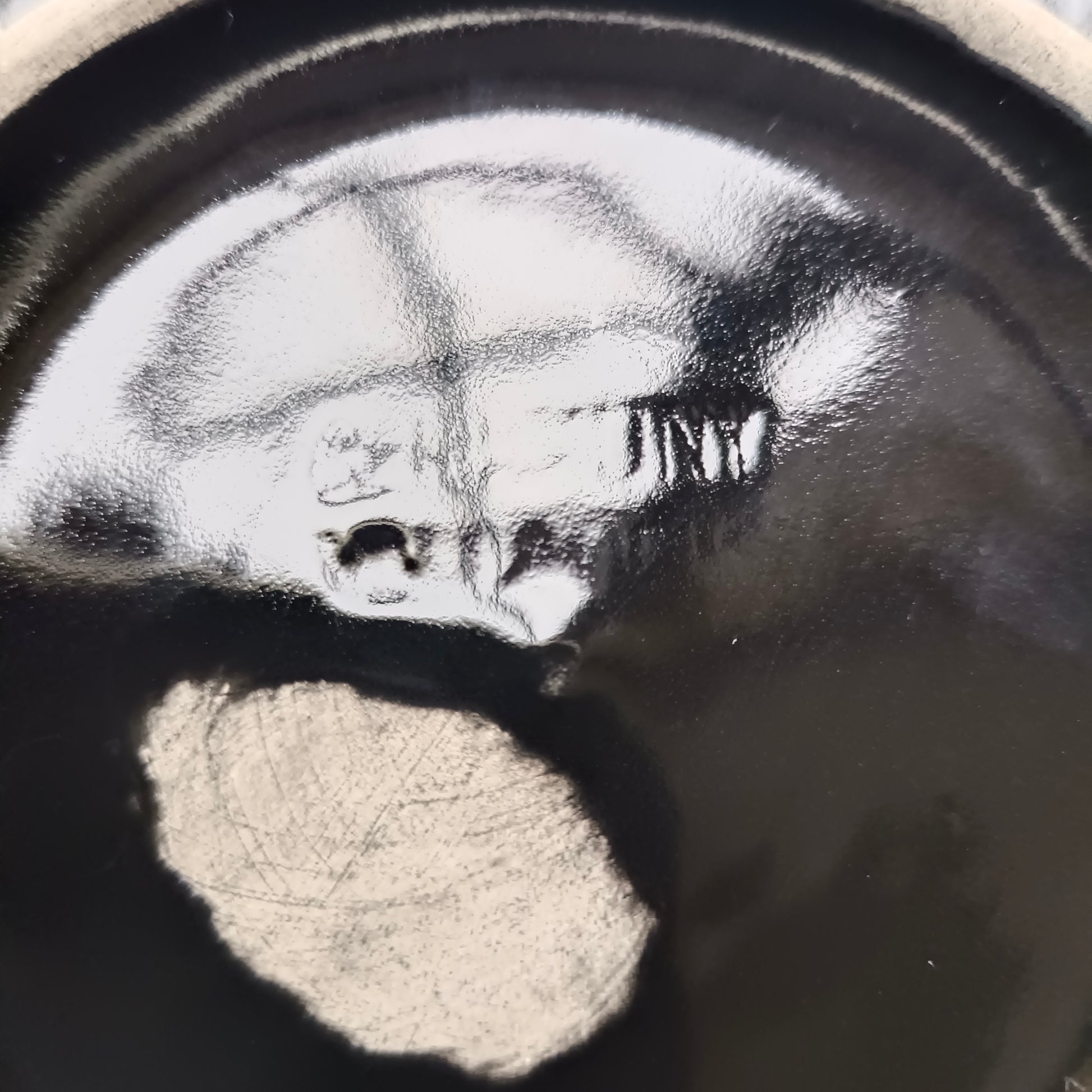 Théière en faïence noire années 60 intérieur jaune, anse torsadée